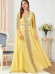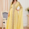 Make a stunning statement with our Djellaba Marocaine Two Piece Muslim Dress. This gorgeous party style kaftan features a beautiful chifton print, embroidery, and a belt for a perfect fit.