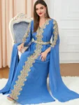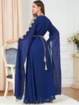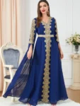 Introducing the Djellaba Marocaine Two Piece Muslim Dress, a stunning abayas for the modern woman. This gorgeous party style kaftan features a beautiful chifton print, embroidery, and a belt for a perfect fit. The extra long sleeves and V-neck design add a touch of elegance, making it perfect for formal occasions or everyday wear.
