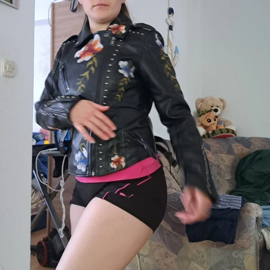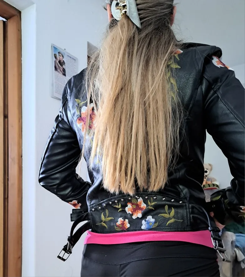 The turn-down collar and zipper closure provide a sleek and modern look, while the embroidery and rivet details add a touch of industrial chic. Whether you’re heading to a concert, a night out with friends, or just want to add some edge to your everyday look, this jacket is the perfect choice.