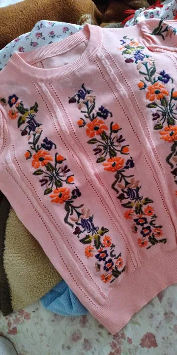Vogue Embroidered Short Sleeve Puff Sleeve Acrylic Pullover