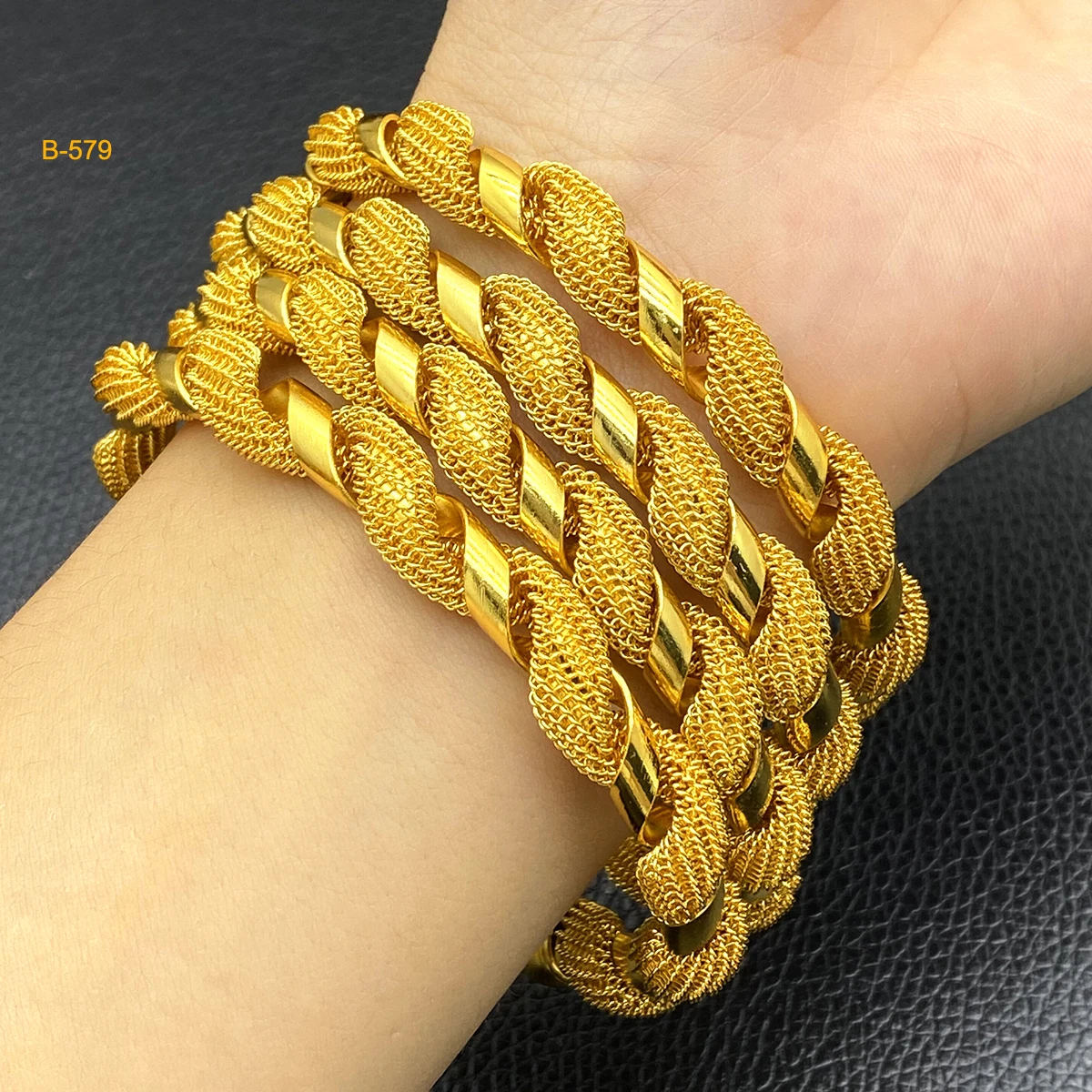 Elevate your style with our Luxury Dubai 24K Gold Color Bangles. Featuring a round shape and gold-color plating, these bangles are perfect for any occasion.